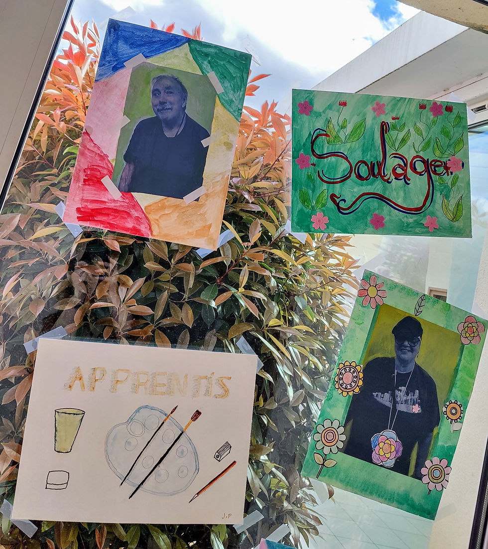 En Aquarêves, les résidents ont terminé des œuvres commencées il y a longtemps. Xavier leur avait demandé d'imaginer une décoration artistique autour d'une photo d'eux-mêmes et, sur un autre support, une composition en images et en mot(s) qui exprime ce que représentait pour eux l'activité Aquarêves :