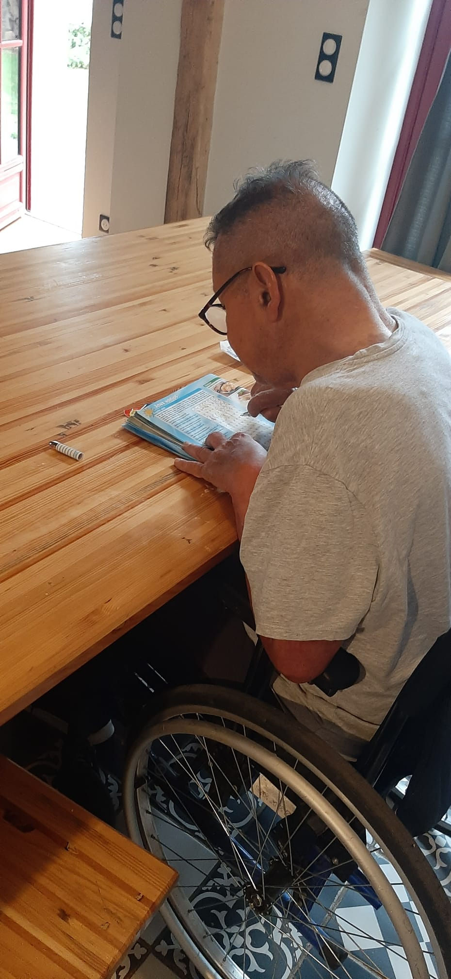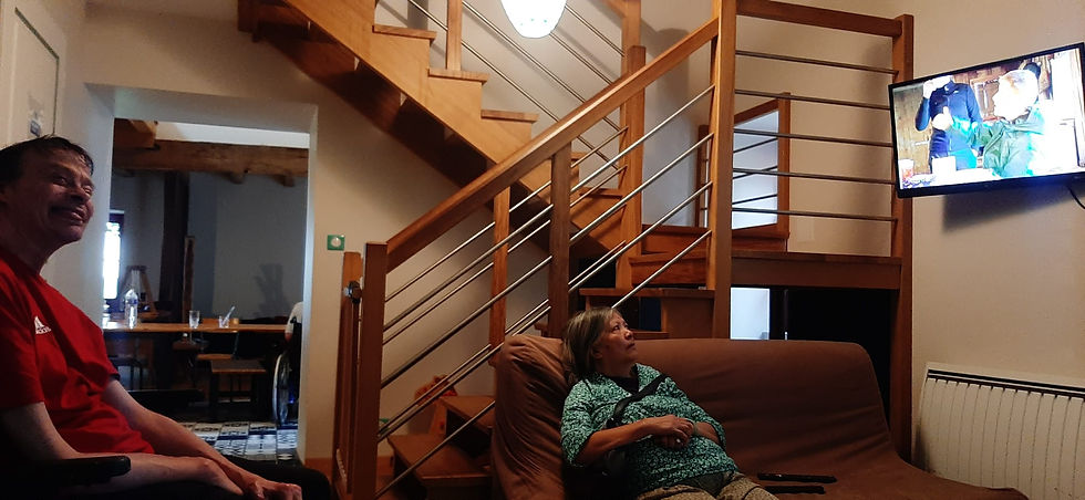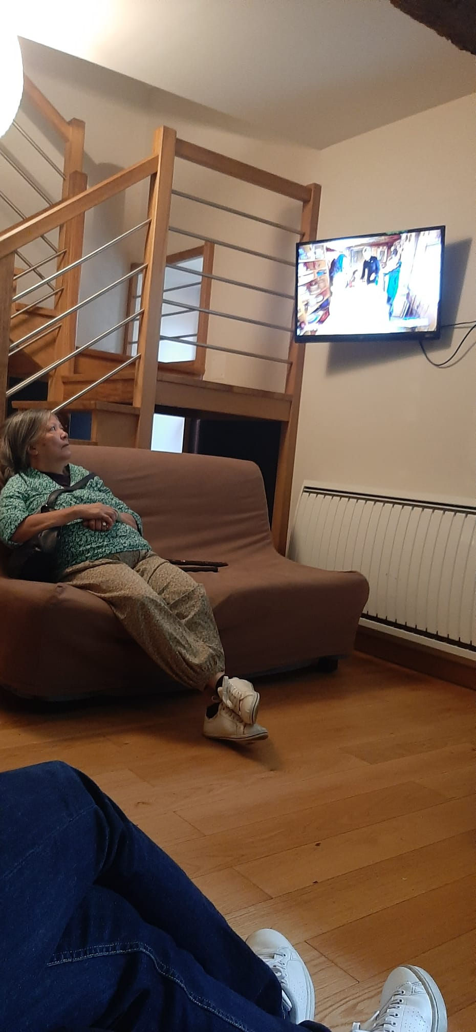 Après les émotions de la matinée, les vacanciers ont pris un peu de repos au gite (télé, mots mêlés et jeux avec le chat) avant d'aller faire un petit tour en ville. L'enseigne du coiffeur les a fait sourire et ils n'ont pas pu s'empêcher d'avoir une petite pensée pour Fédéric D., résident du FAM 😁